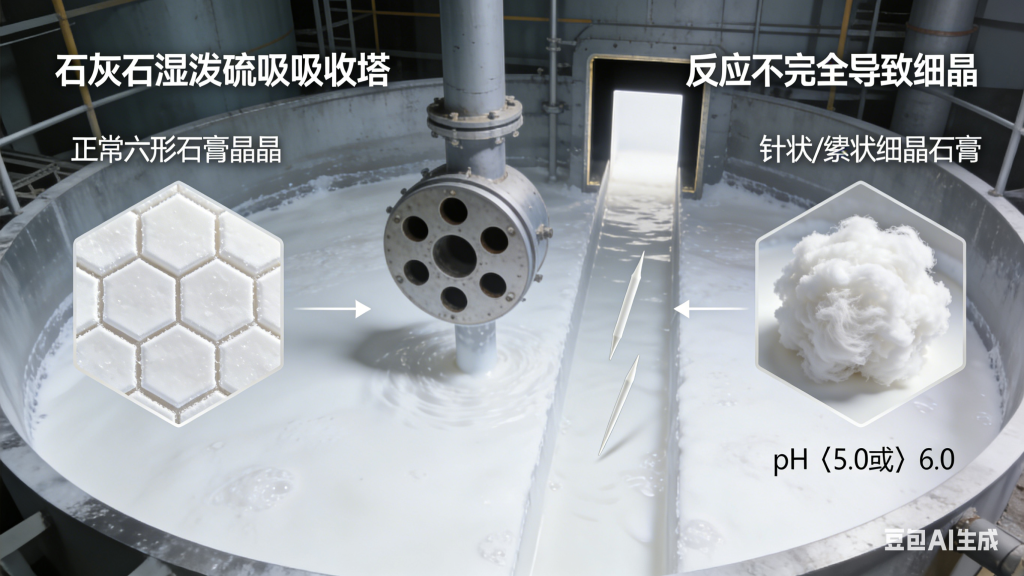 Одновременно с этим, неправильный контроль pH в абсорбционной колонне (слишком низкий <5,0 или слишком высокий >6,0) препятствует нормальному росту кристаллов гипса. Это приводит к образованию большого количества игольчатых или хлопкообразных мелких кристаллов, что еще больше усугубляет проблемы с обезвоживанием.