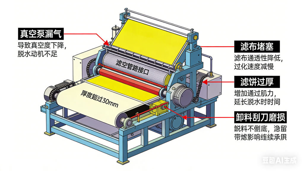 Неисправности вакуумного насоса (такие как износ рабочего колеса или утечка уплотнения), засорение вакуумной линии или утечка воздуха могут привести к падению вакуумного давления фильтр-пресса ниже требований технологического процесса (обычно ≥0,04–0,06 МПа), что не позволяет обеспечить достаточное всасывание для извлечения влаги из фильтр-кека.